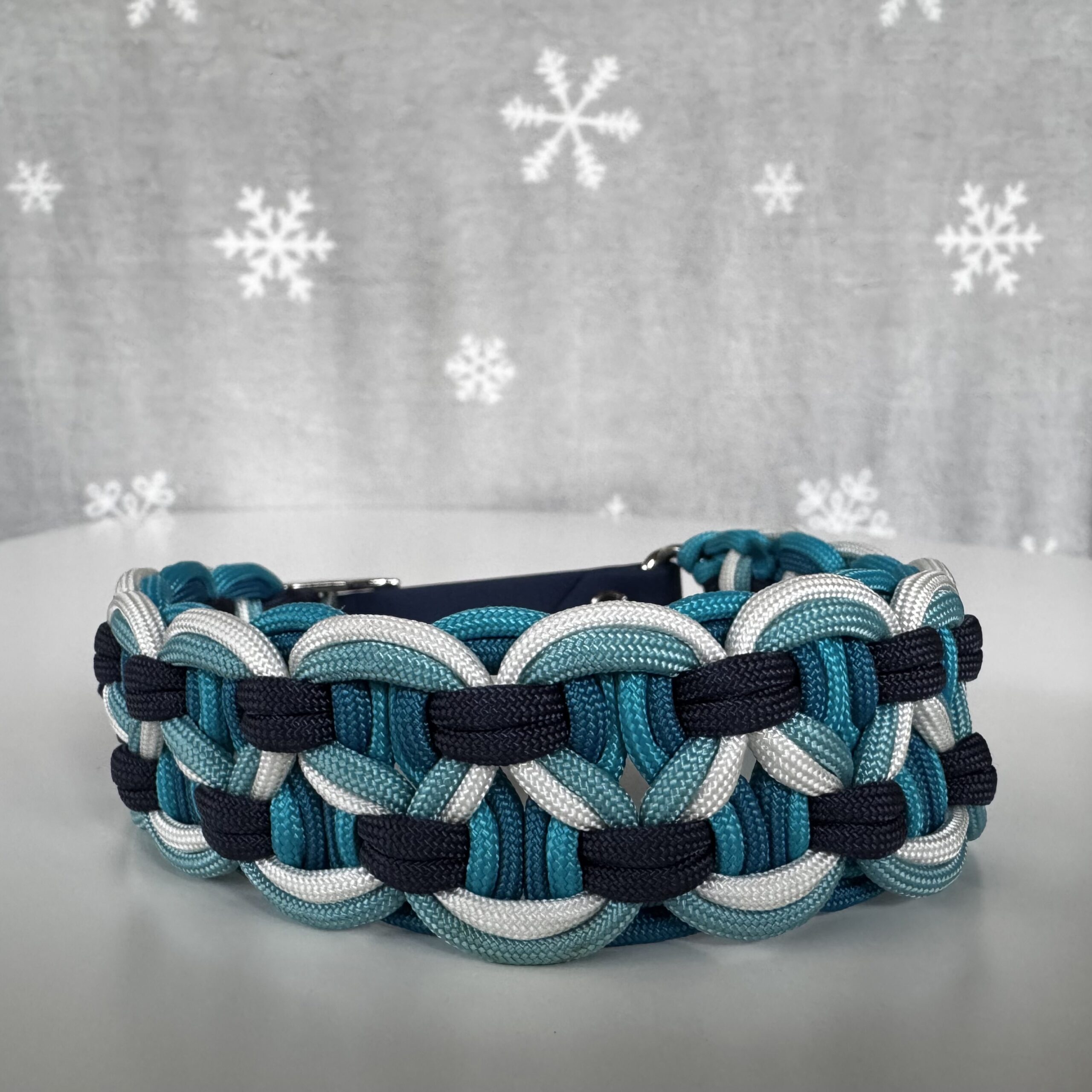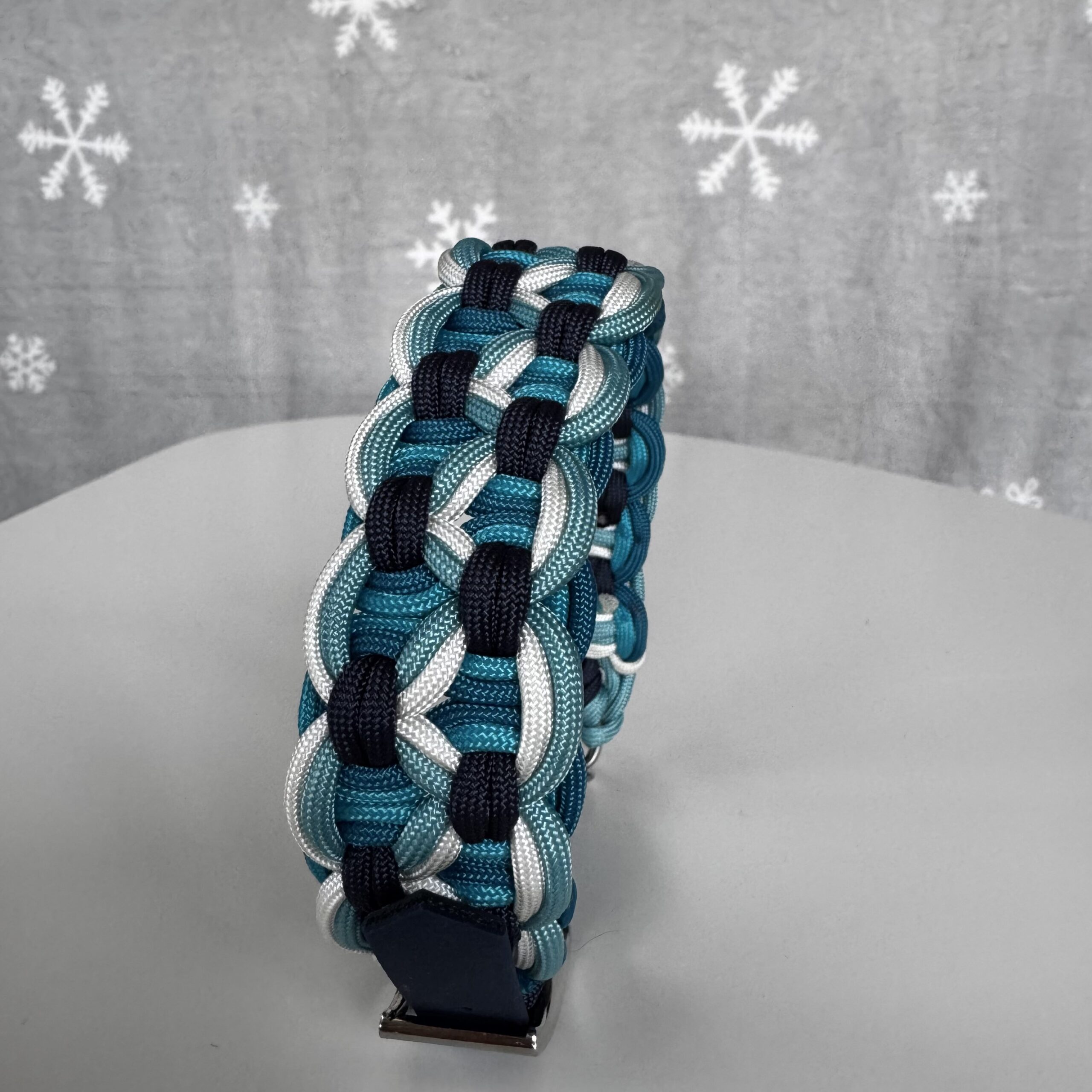 Realizzato in paracord, con moschettoni e anelli in acciaio. Chiusura regolabile in BioThane.