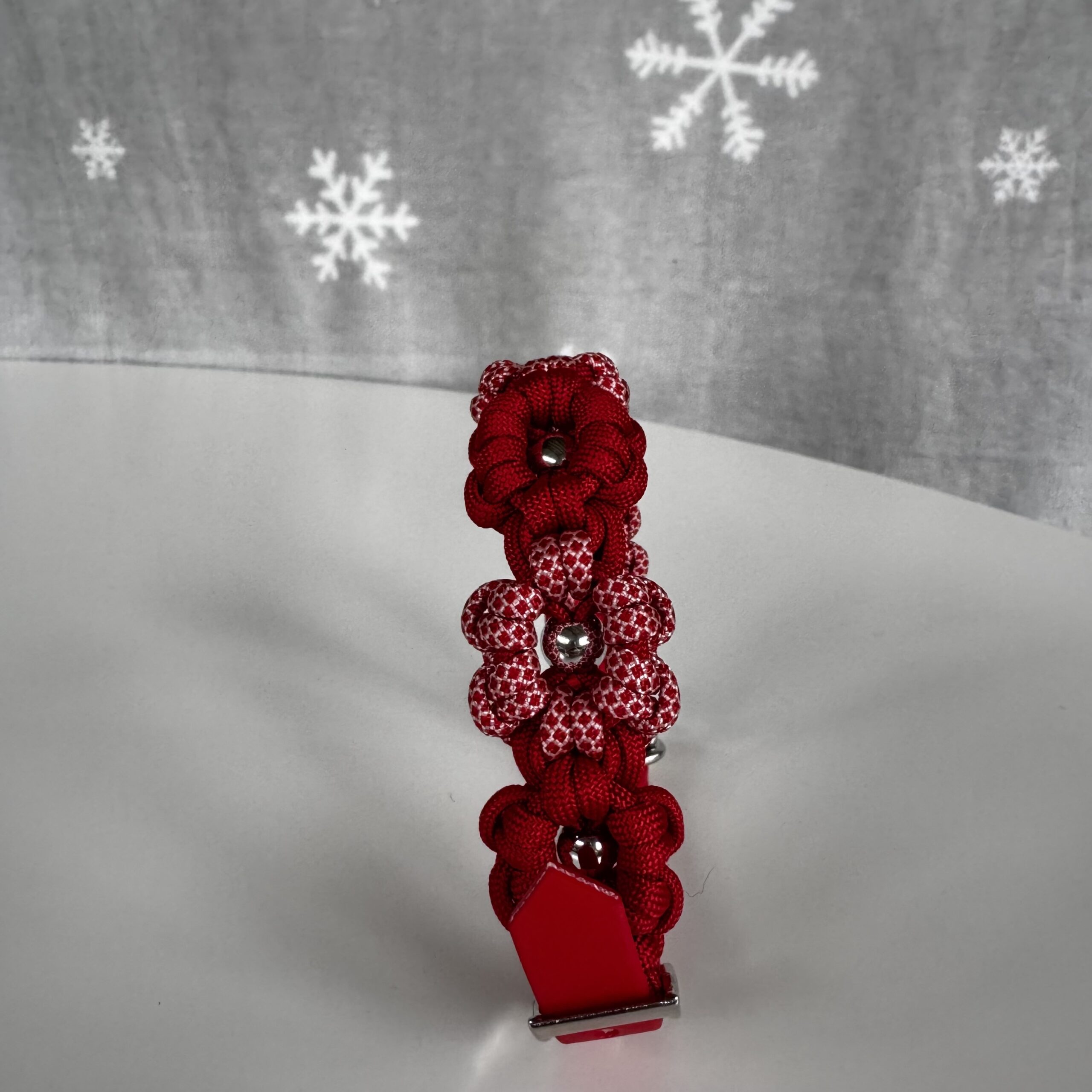 Realizzato in paracord, con moschettoni e anelli in acciaio. Chiusura regolabile in BioThane.