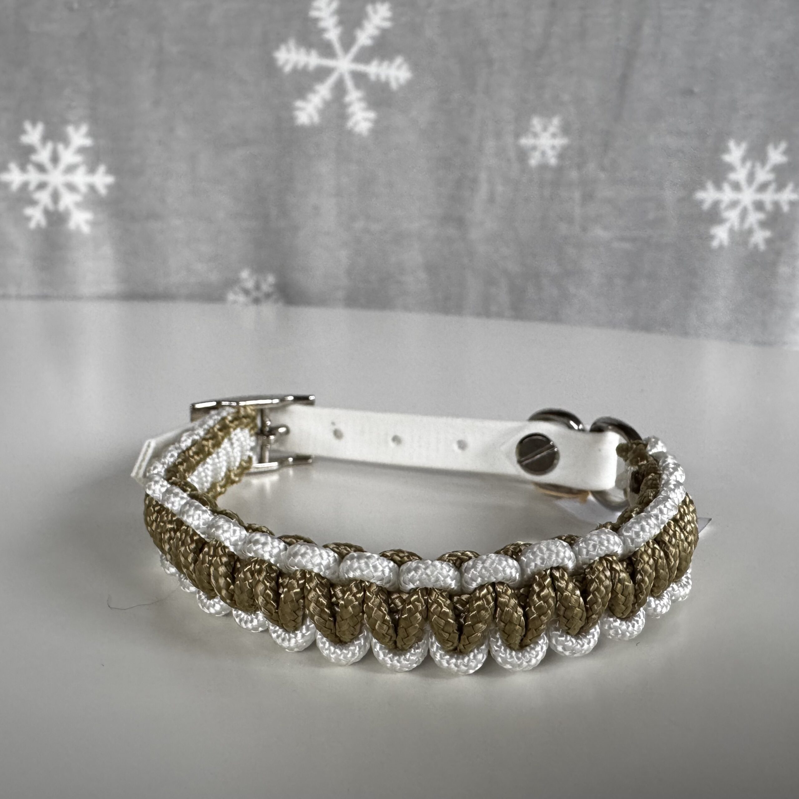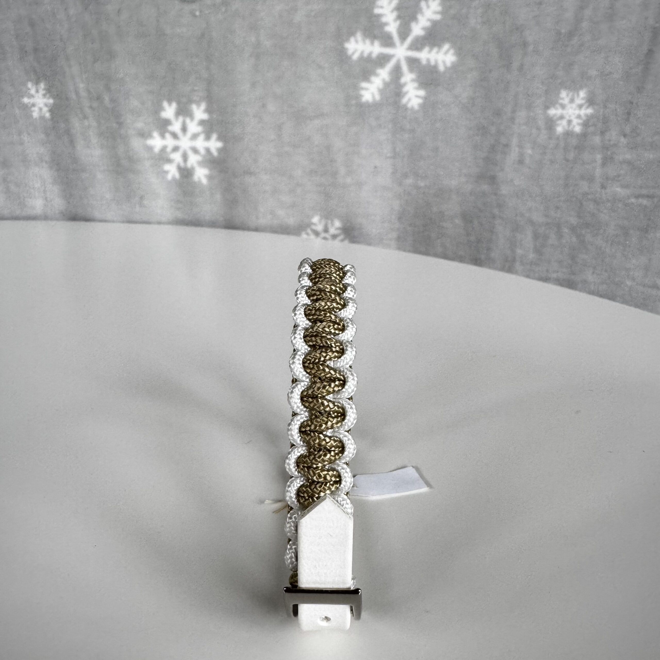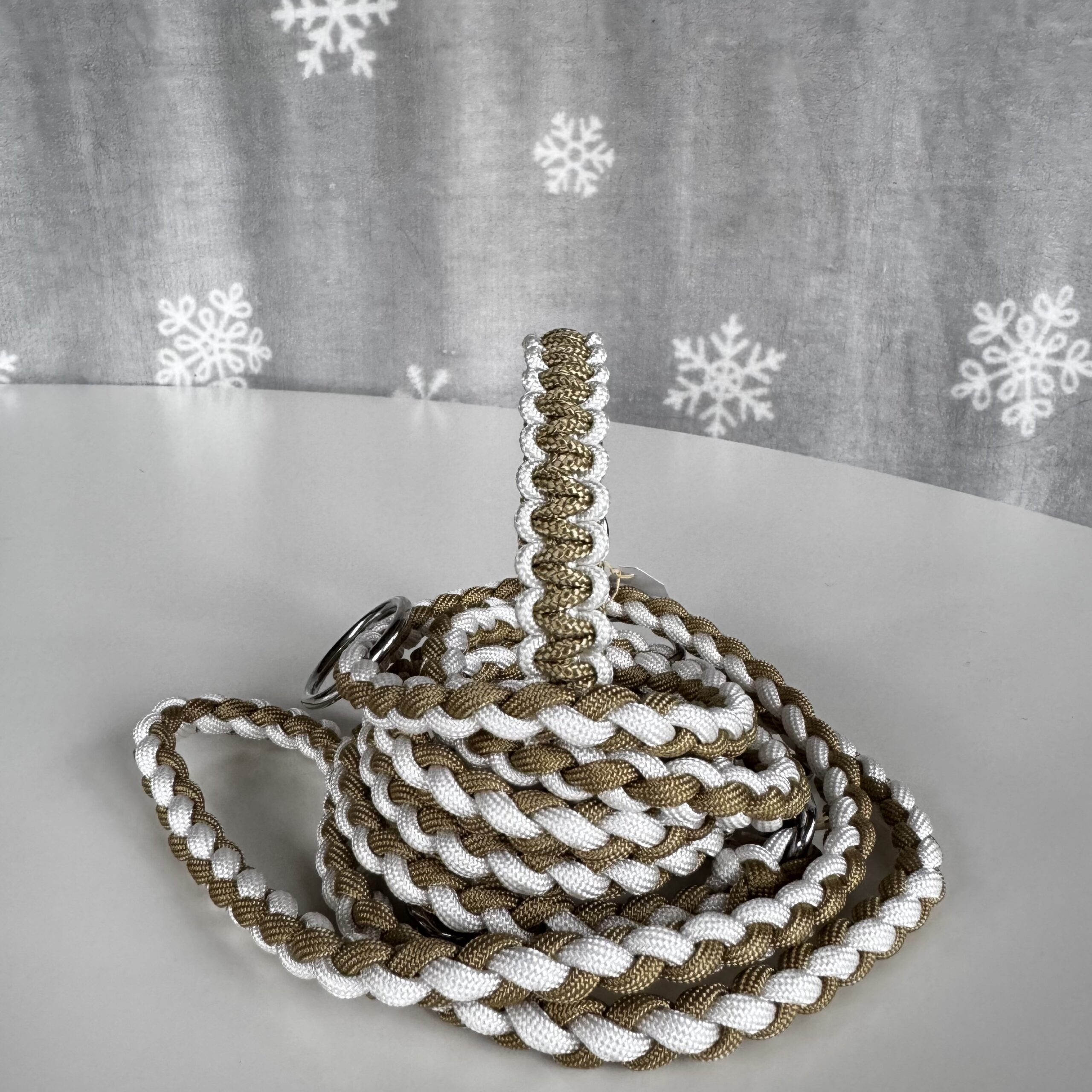 Realizzato in paracord, con moschettoni e anelli in acciaio. Chiusura regolabile in BioThane.
