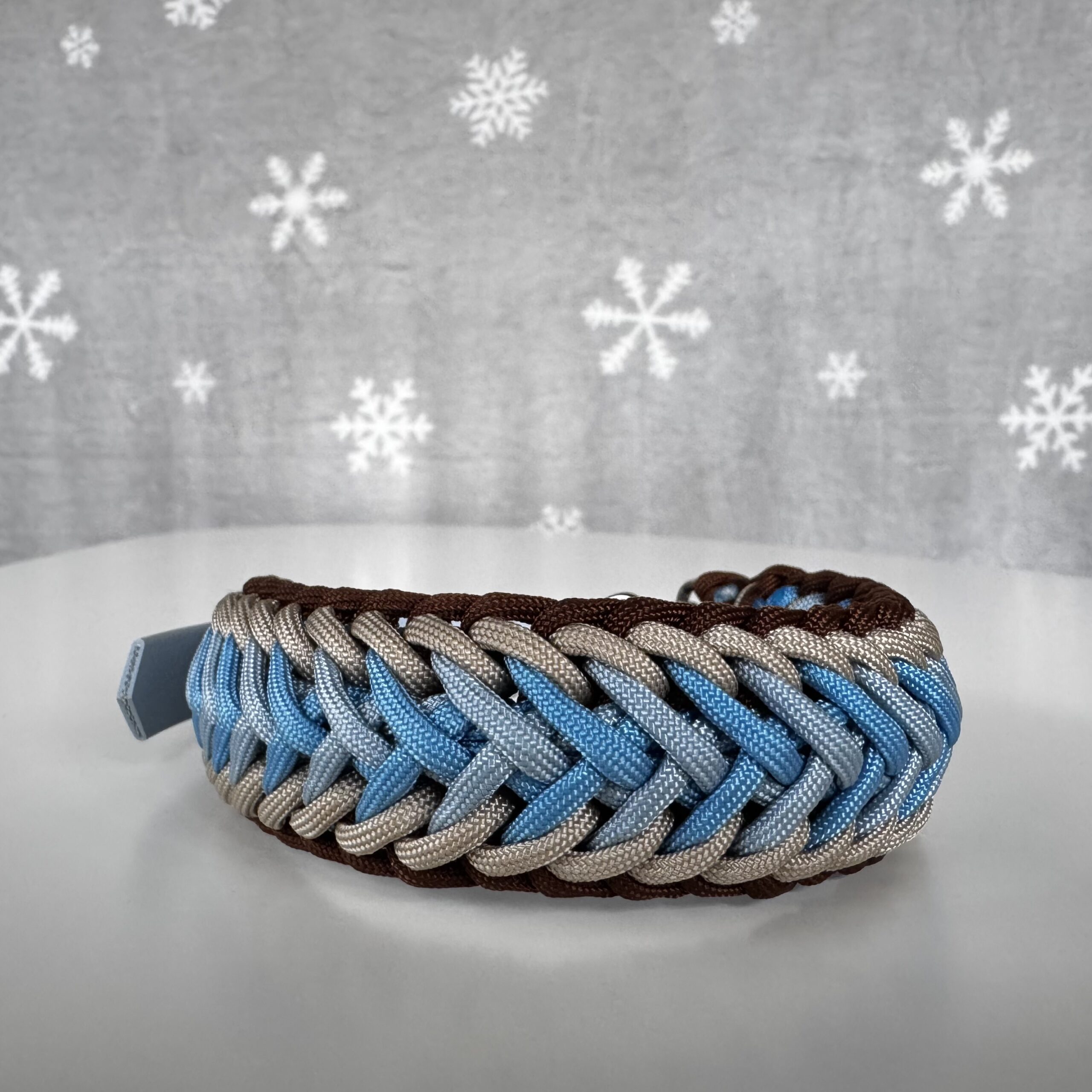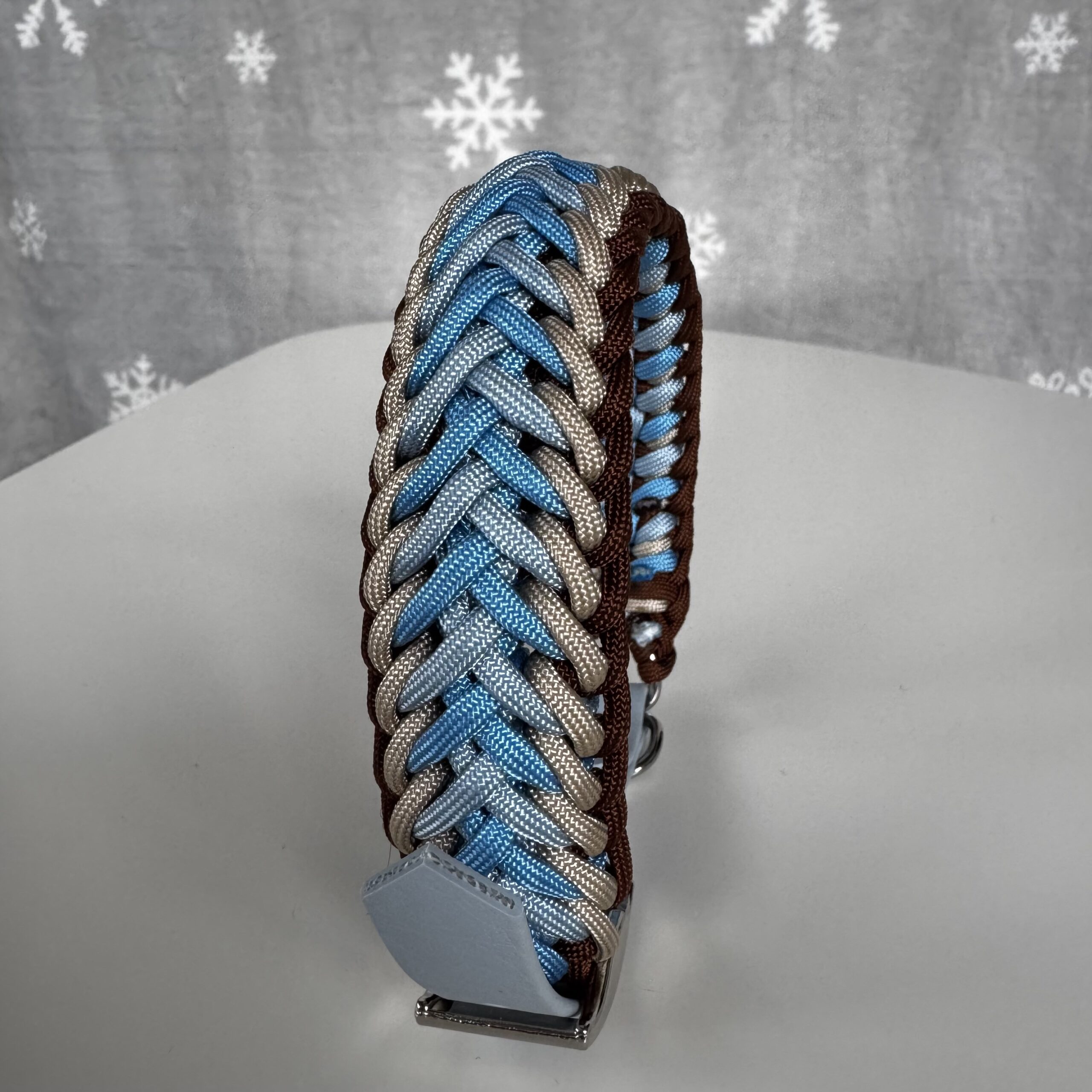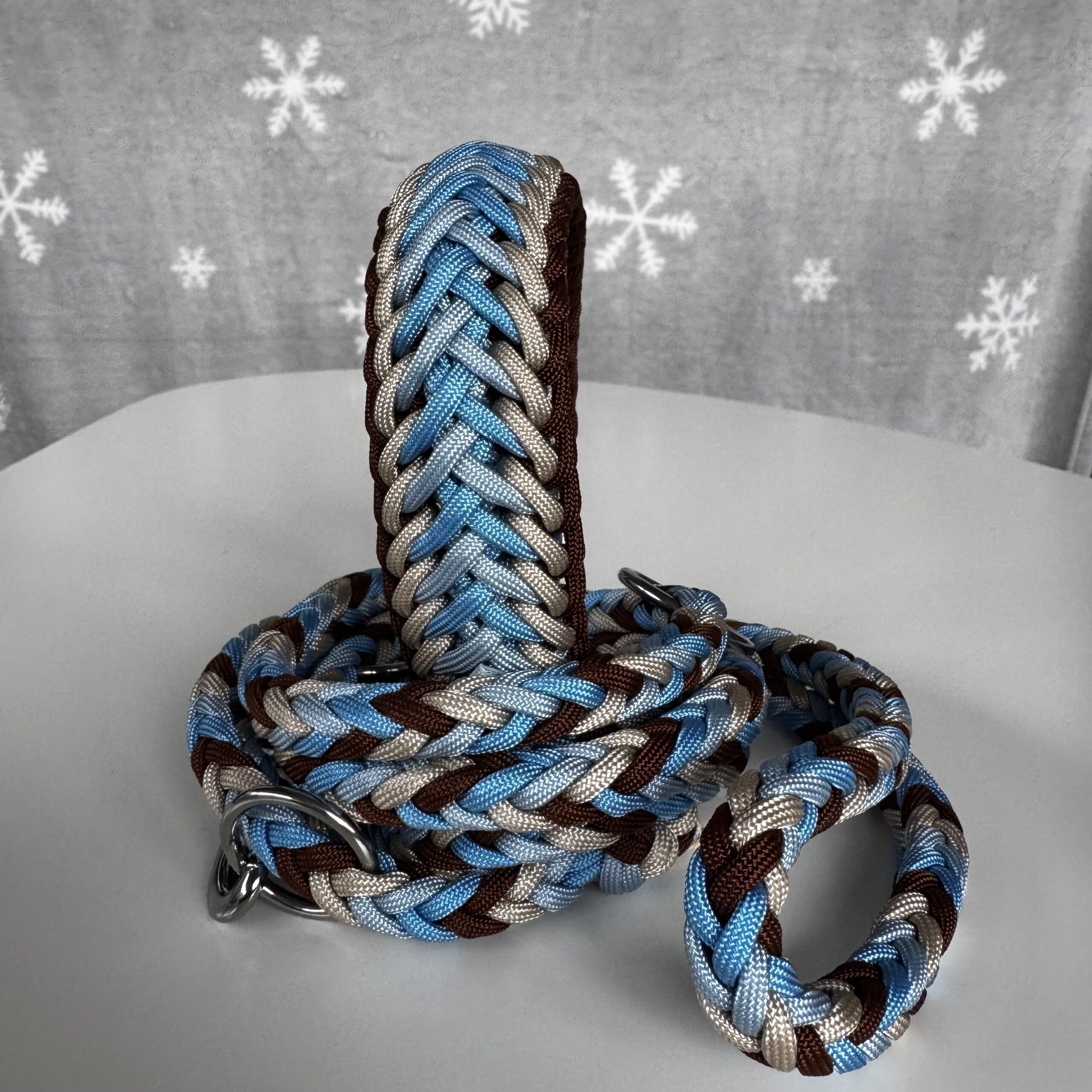 Collare intrecciato per cani di media/grossa taglia. Circonferenza collo regolabile da 33 a 39 cm. Realizzato in paracord, con moschettoni e anelli in acciaio. Chiusura regolabile in BioThane. Lavabile in lavatrice a 30 gradi.