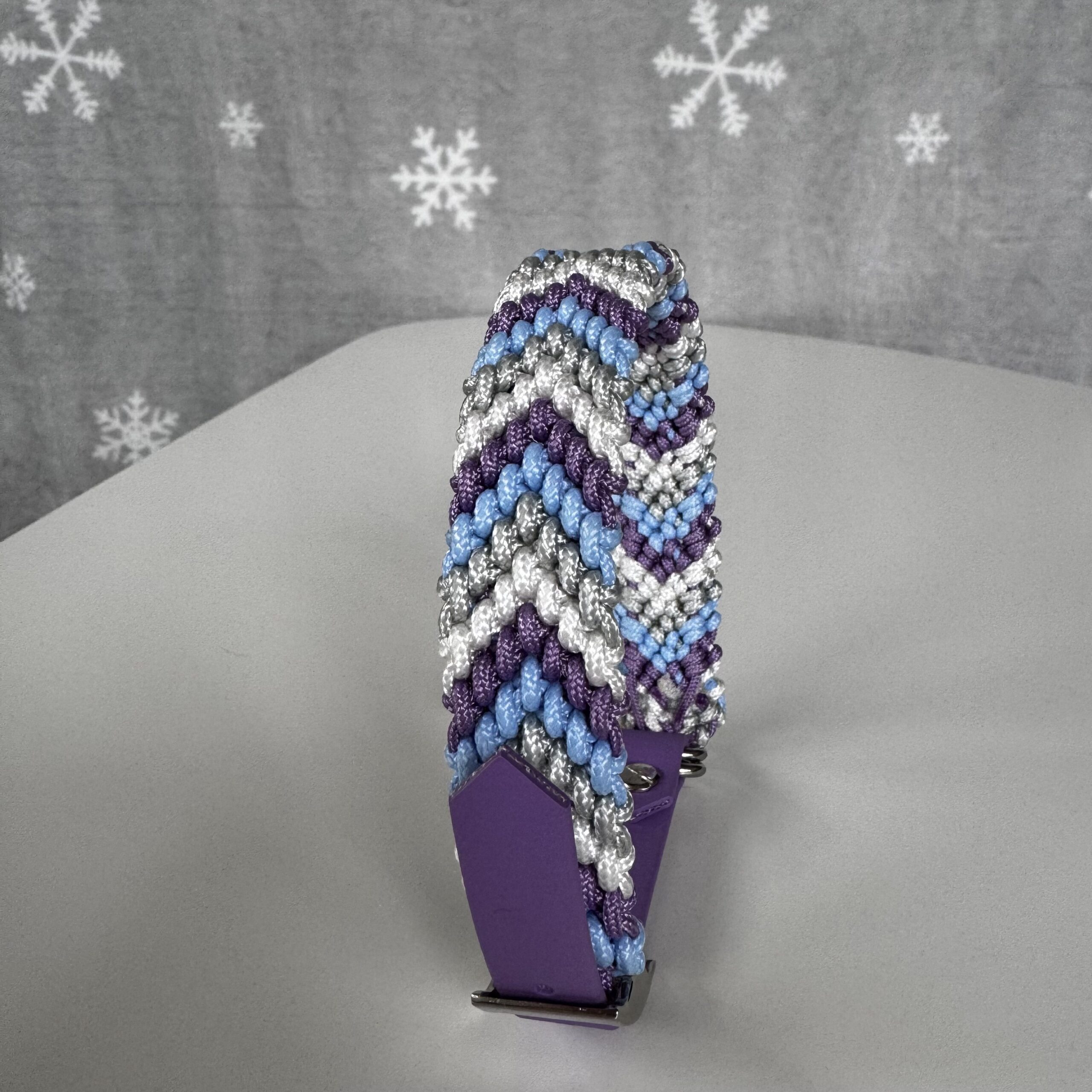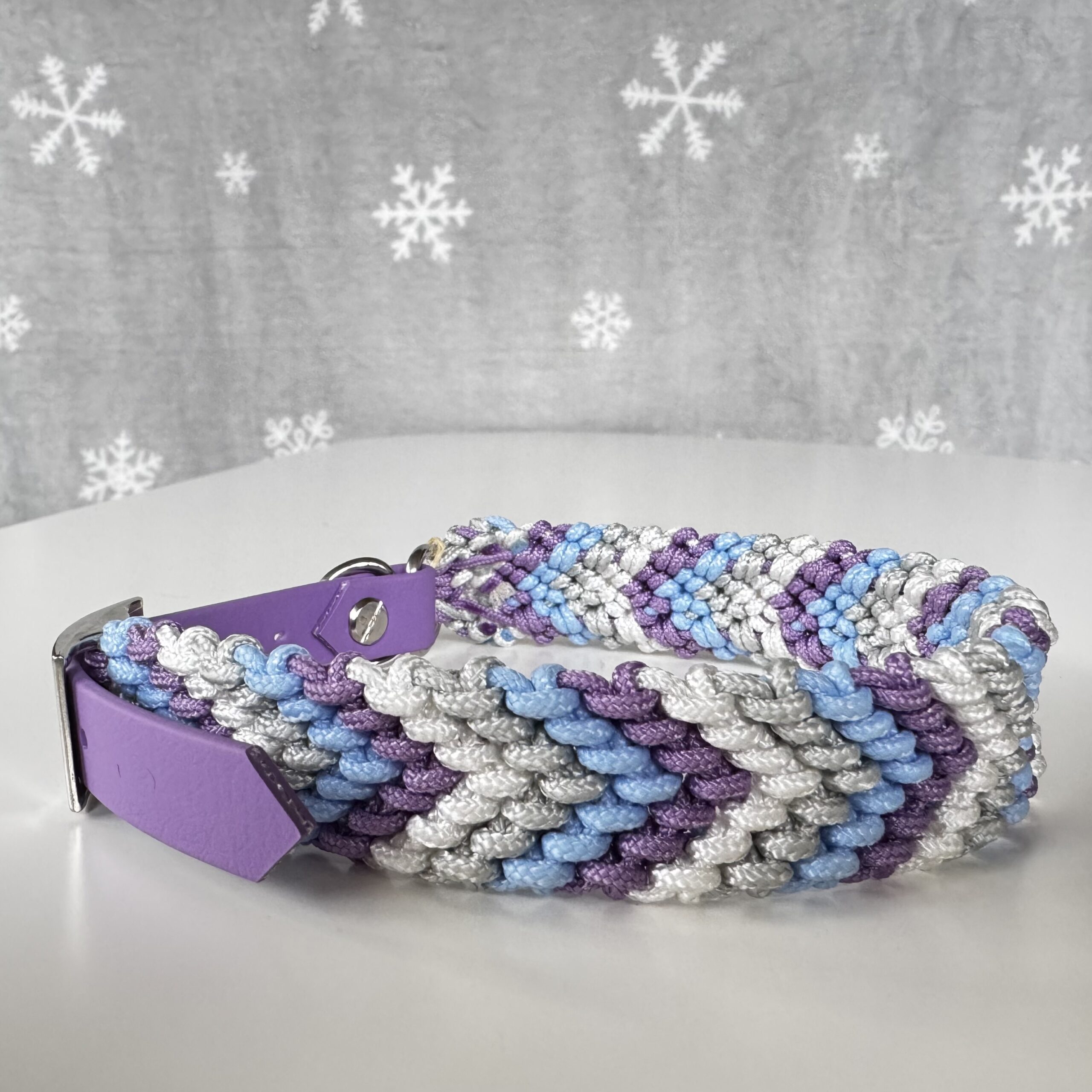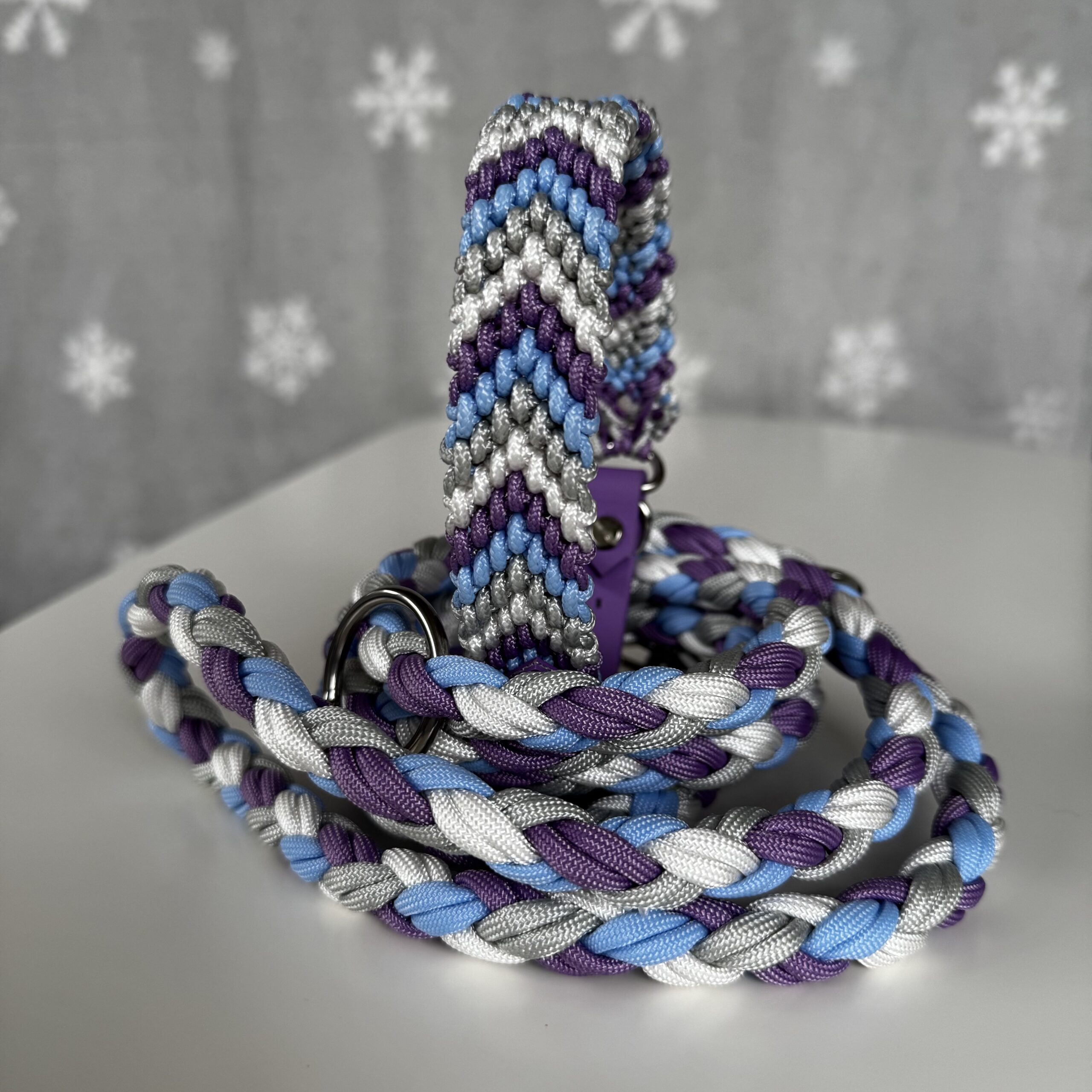 Realizzato in paracord, con moschettoni e anelli in acciaio. Chiusura regolabile in BioThane.