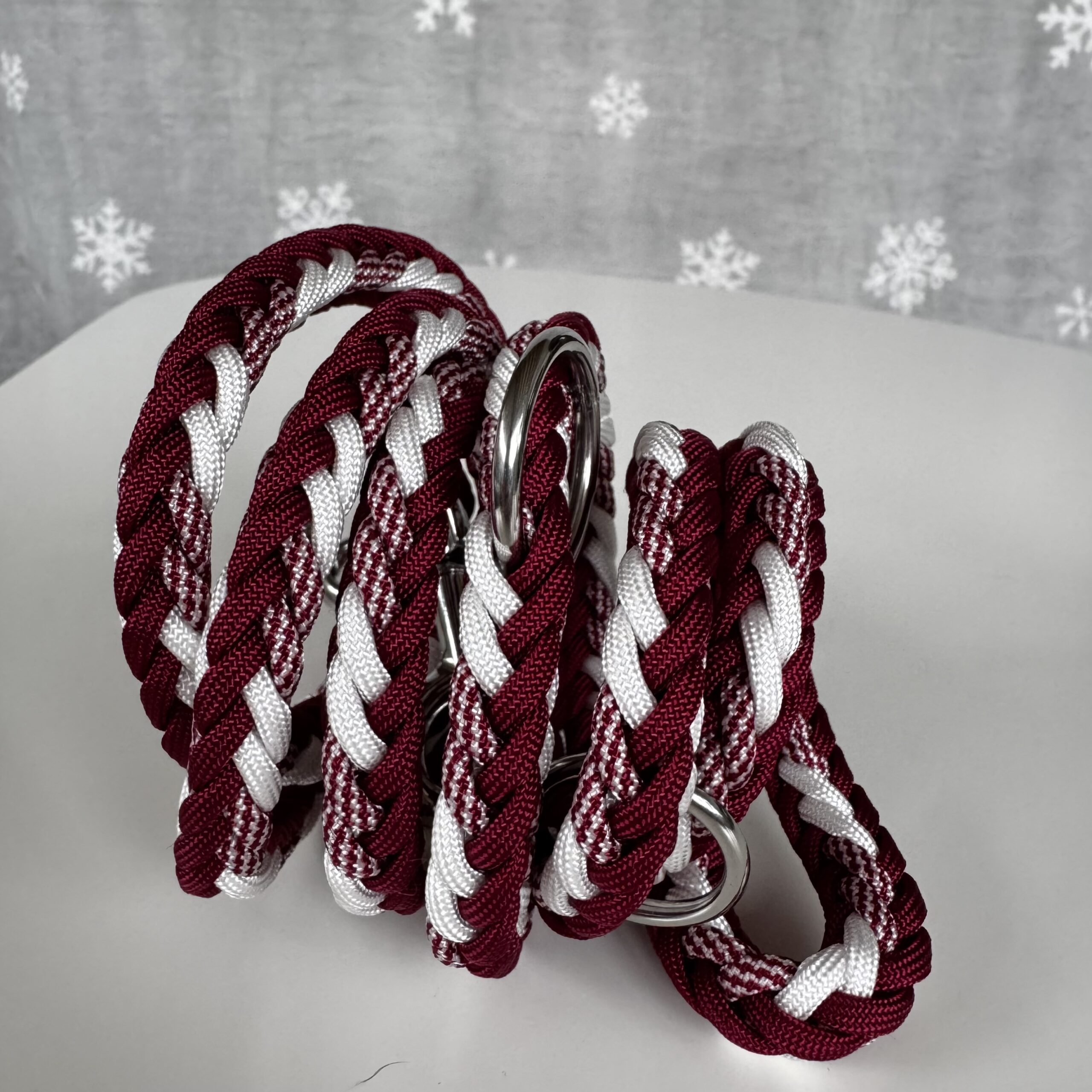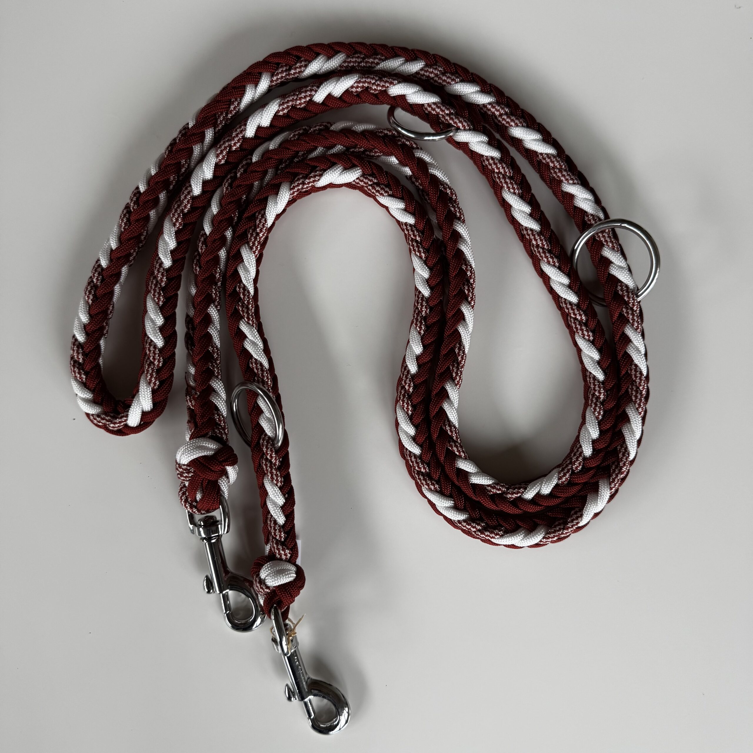 Realizzato in paracord, con moschettoni e anelli in acciaio.