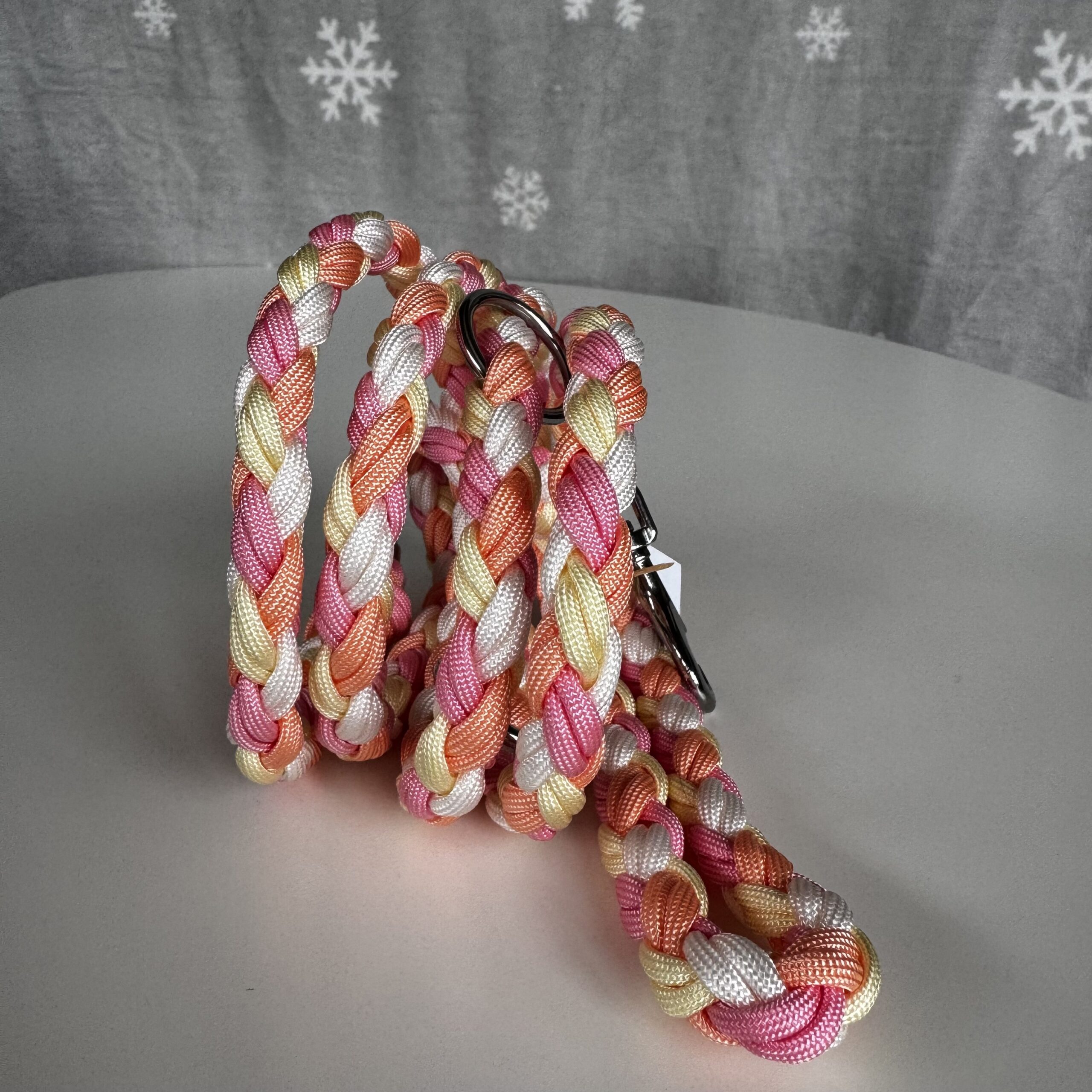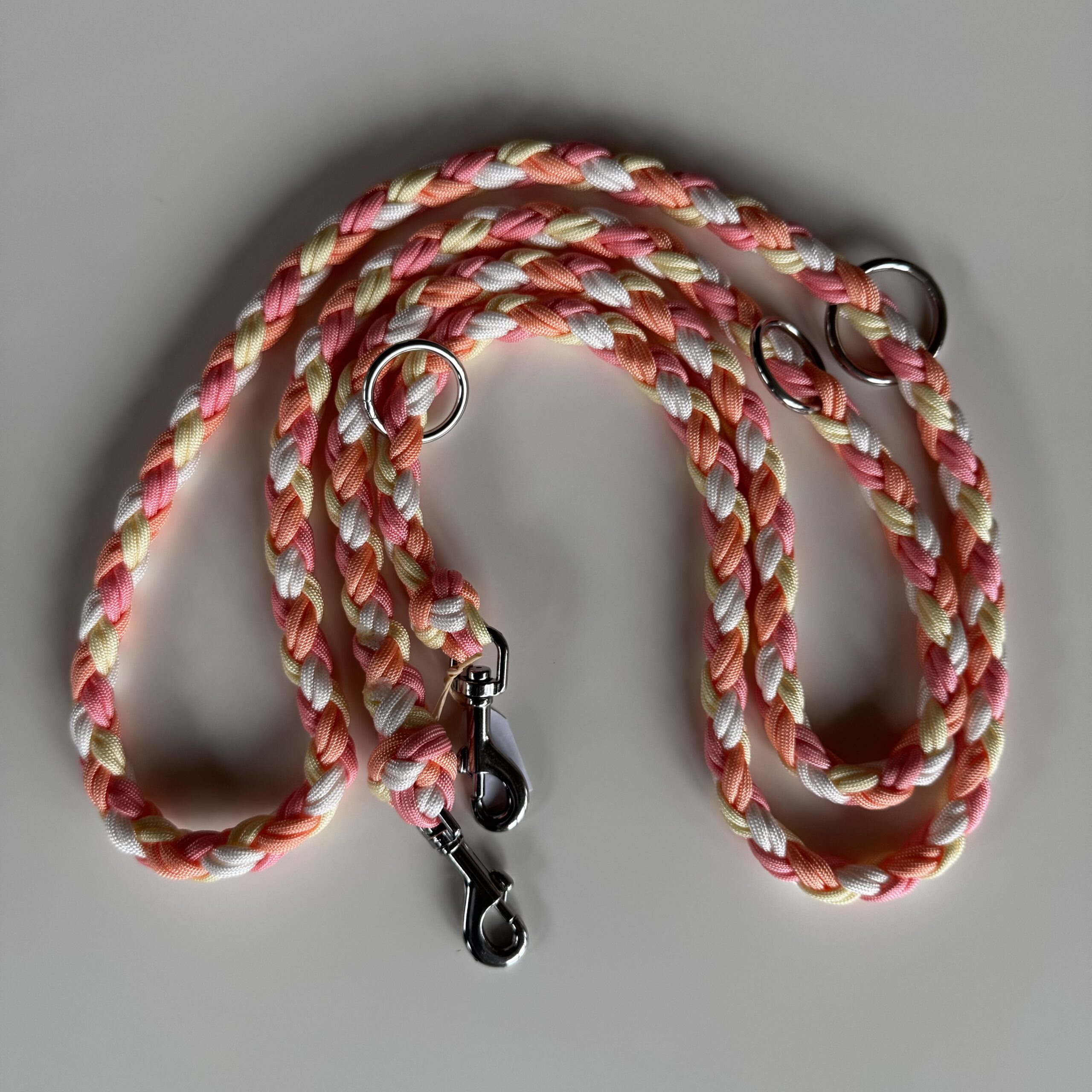 Realizzato in paracord, con moschettoni e anelli in acciaio.
