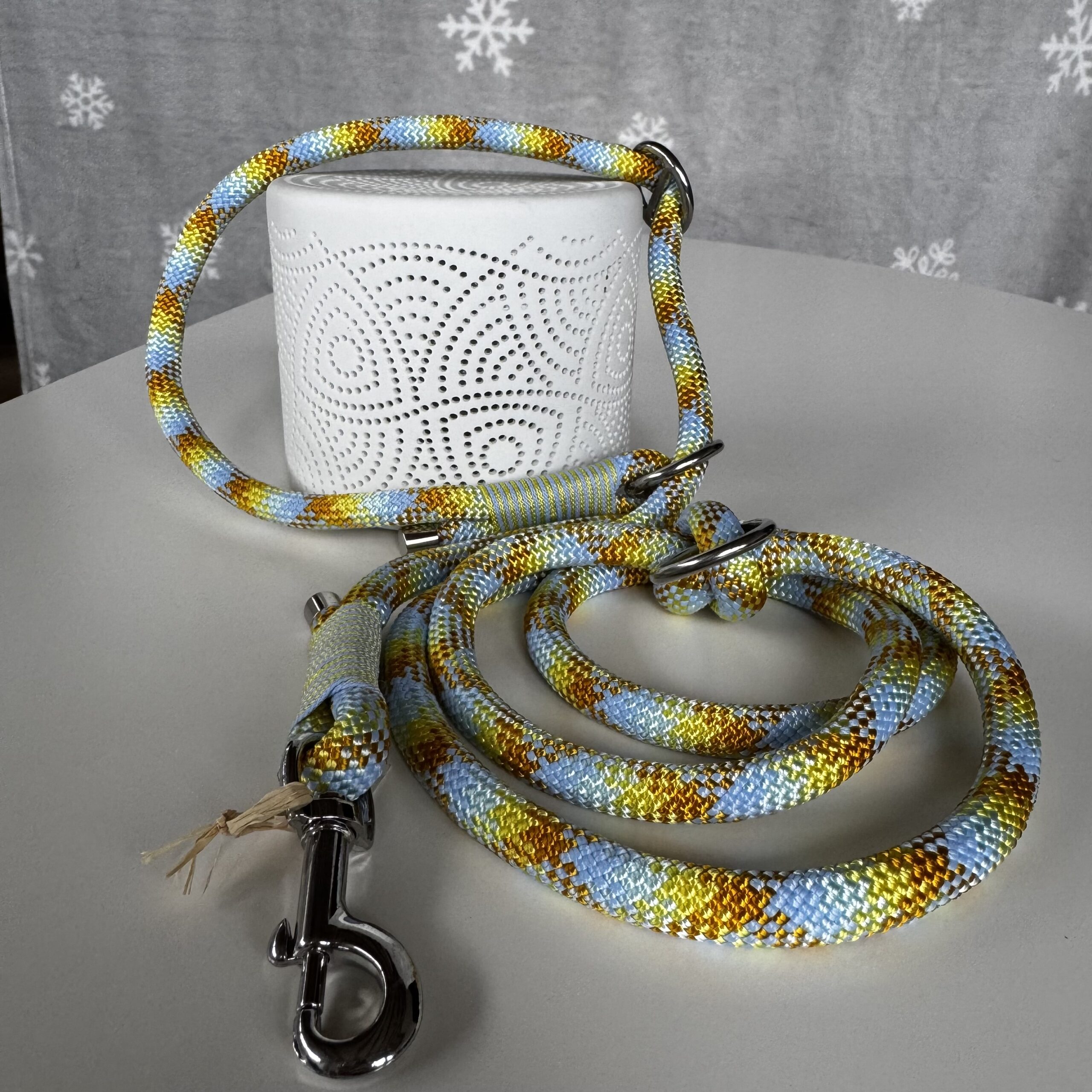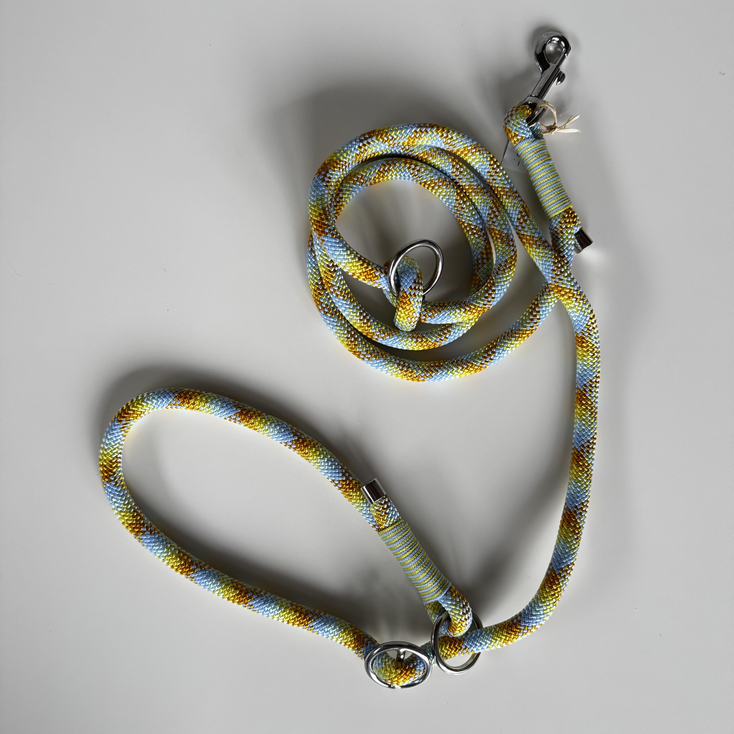 Guinzaglio retriever in corda e accessori in acciaio.